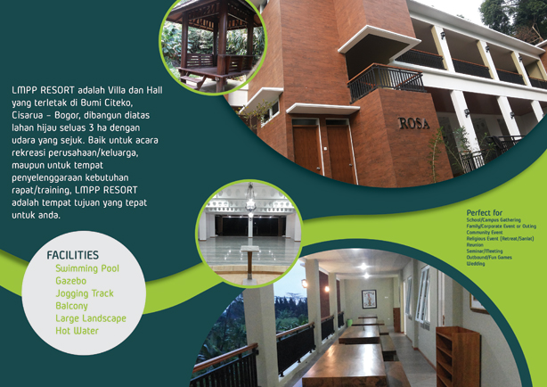 LMPP RESORT adalah Villa dan Hall yang terletak di Bumi Citeko ,Cisarua –Bogor, dibangun diatas lahan hijau seluas 3 ha dengan udara yang sejuk. Baik untuk acara rekreasi perusahaan, keluarga, maupun untuk tempat penyelenggaraan kebutuhan rapat atau training , LMPP RESORT adalah tempat tujuan yang tepat untuk anda.